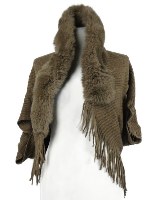 Dámsky hnedý svetrový cardigán s kožúškom a strapcemi