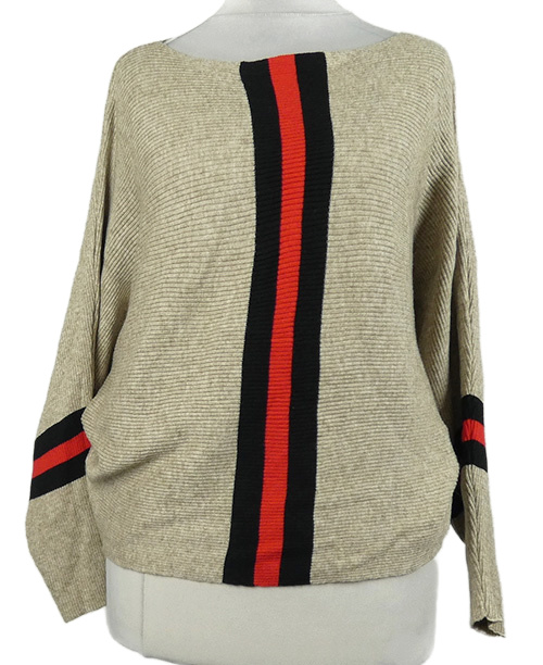 Dámsky béžový rebrovaný voľné ý sveter s pruhmi
