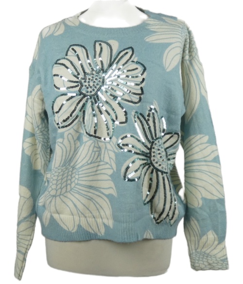 • Dámsky světlemodro-biely kvetovaný sveter s flitrami Blue Vanilla