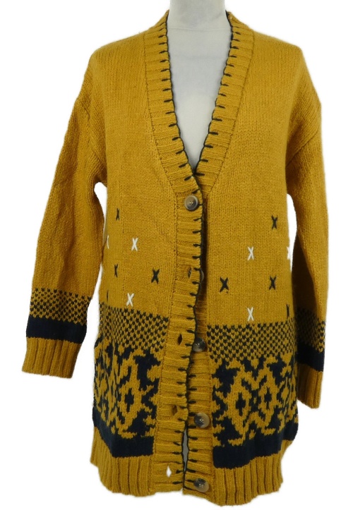 • Dámsky okrovo-tmavomodrý vzorovaný prepínaci dlhý sveter Falmer