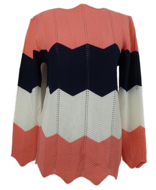Dámsky ružovo-tmavomodro-biely vzorovaný ažurový sveter