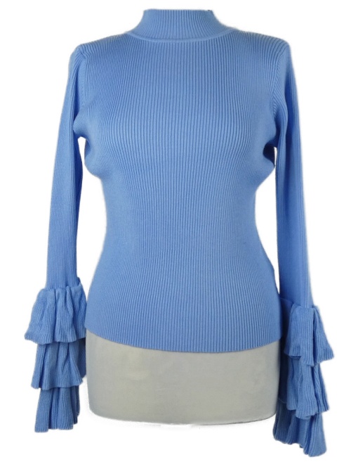 Dámsky svetlomodrý rebrovaný crop sveter s volánky na rukávech By Clara