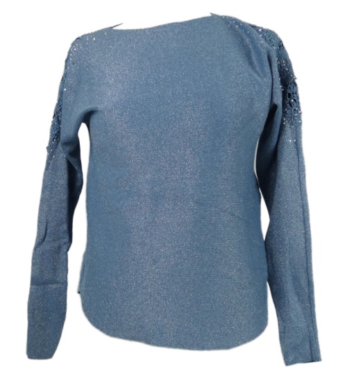 Dámsky svetlomodrý trblietavý sveter s čipkou a kamienkami