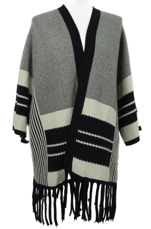 Dámsky čierno-biely pruhovaný svetrový cardigán s strapcemi