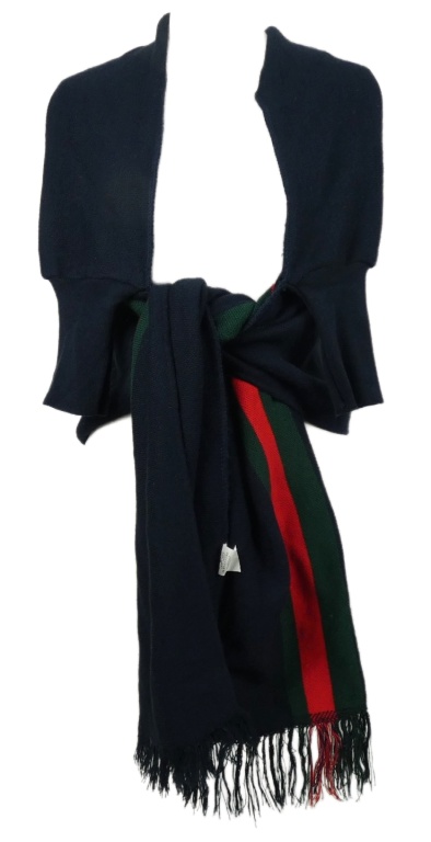 Dámsky tmavomodro-červeno-zelený svetrový cardigán s šálou