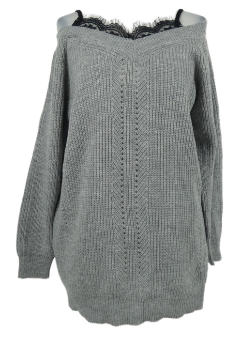 Dámsky sivý ažurový dlhý sveter s čipkou Bodyflirt