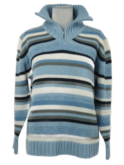 Dámsky světlemodro-sivo-biely pruhovaný sveter s golierom