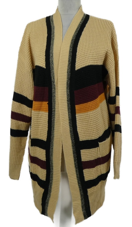 Dámsky béžovo-čierno-vínový pruhovaný svetrový cardigán