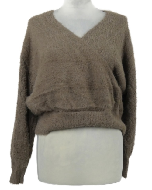 Dámsky hnedý chlpatý překřížený crop sveter Gallery