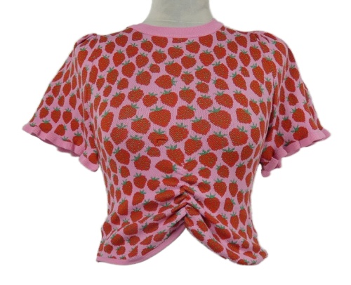 Dámske svetloružová -červené pletené crop tričko s jahodami Savida