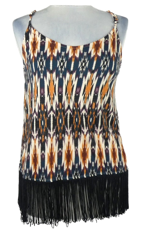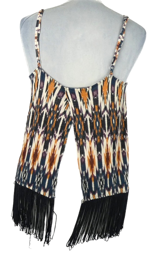 Dámsky tmavomodro-oranžovo-čierny vzorovaný top s strapcemi