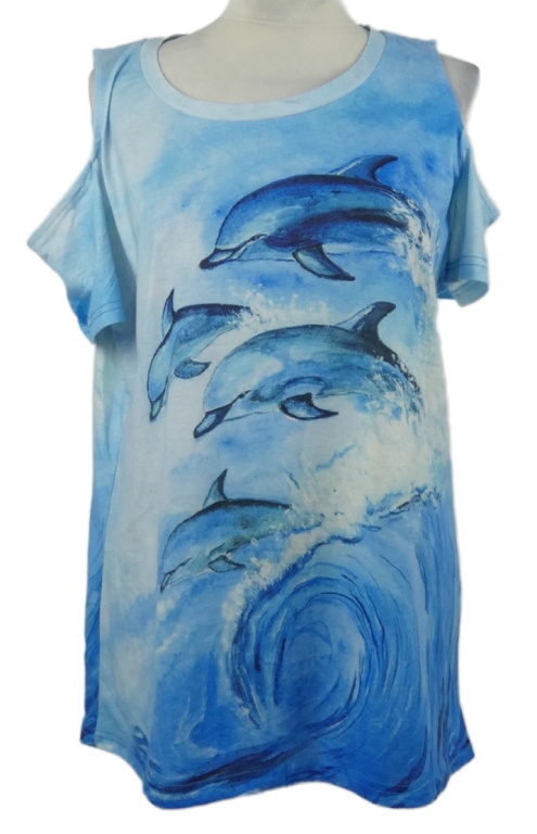 Dámska svetlomodrá tunika s delfínmi a prestrihmi