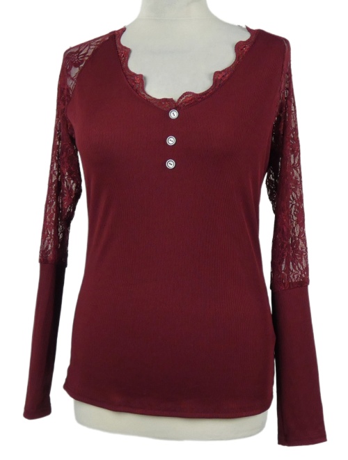 Dámske vínové rebrované tričko s čipkovymi rukávy