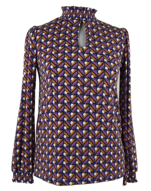 Dámska ružovo-modro-oranžová vzorovaná blúzka so stojačikom