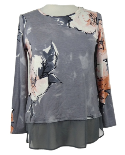 Dámske sivo-ružové kvetované tričko s šifónovým volánikom Roman