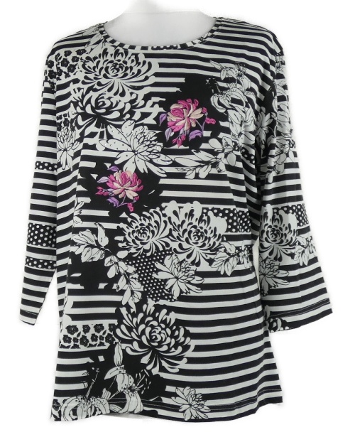 Dámske bielo-črné pruhované tričko s kvetmi a kamienkami Adagio