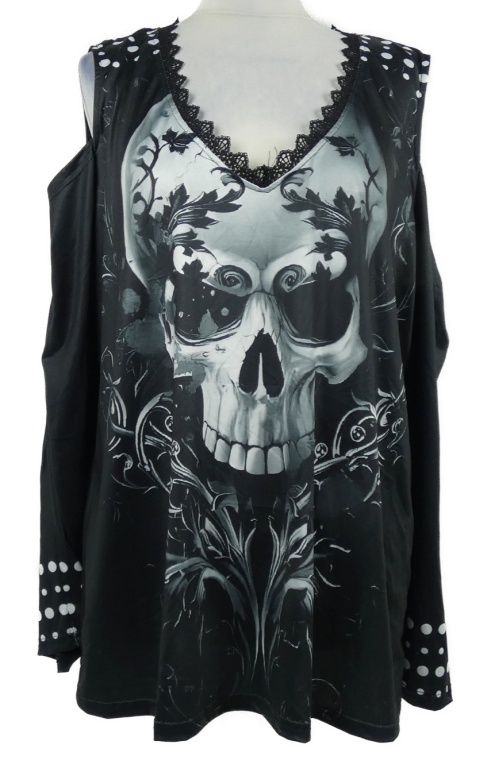 Dámske čierne tričko s lebkou a prestrihmi