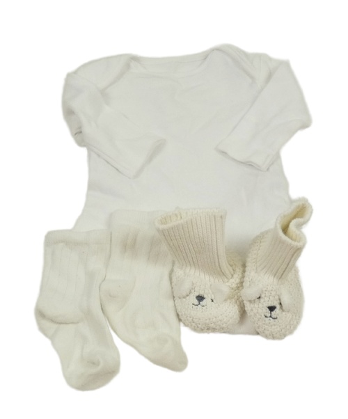 • 3x - Biele body PRIMARK + žebrované ponožky + pletené bačkory s PRIMARK + žebrované ponožky + pletené bačkory s čumáčkem H&M