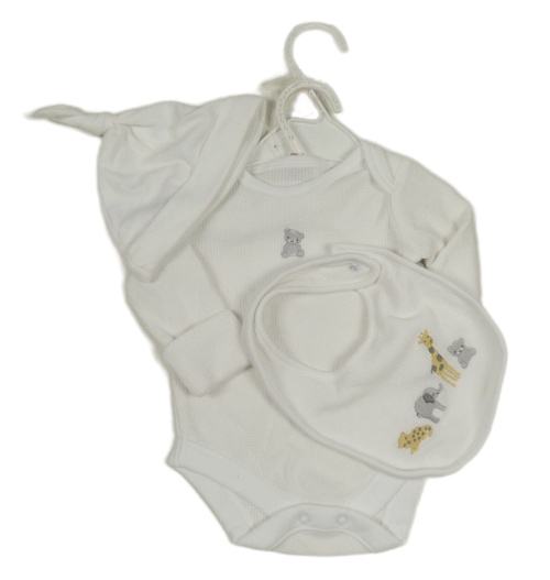 • Nové - 3set - biele body s medvídkem + podbradník s zvířátky + čapica Nutmeg