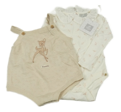 Nové - 2set - Smotanové kvetované body s volánkem + svetlobéžové perforované pletené na traké kraťasy s Bambim Disney