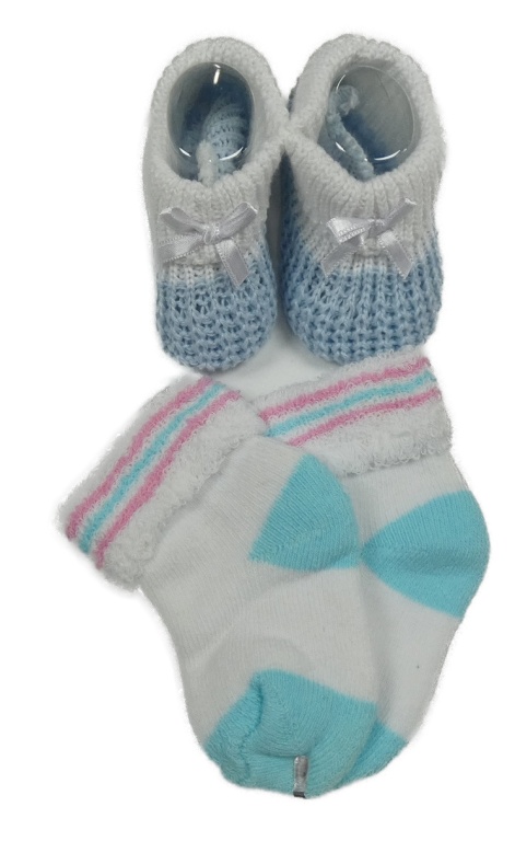 Nové - 2Set - Modro-biele pletené papučky s mašličkou + bílo/azurové teplákové ponožky s pruhmi