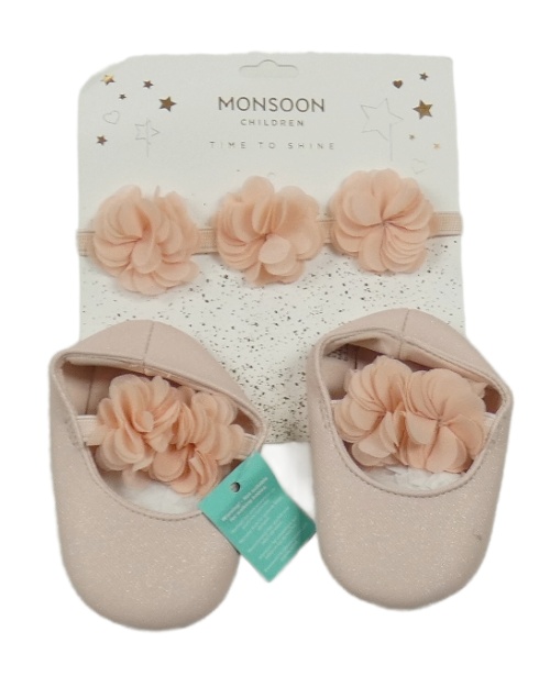 Nové - 2Set - Světlerůžové třpytivé capčáčky s 3D květy + čelenka Monsoon vel. 16-18