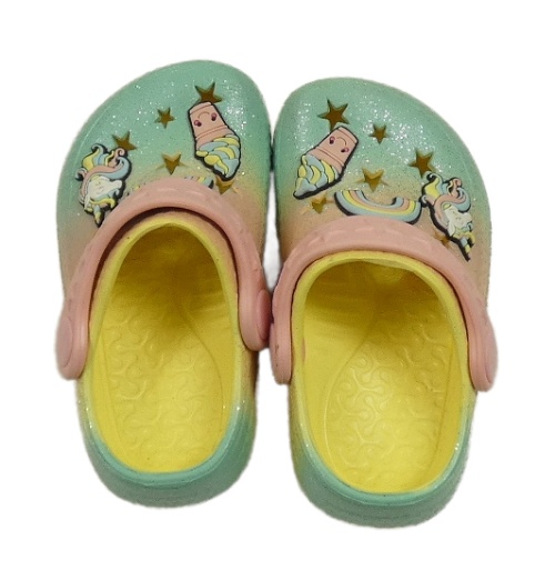 Mátovo-růžovo-žluté třpytivé gumové nazouváky s obrázky vel. 22