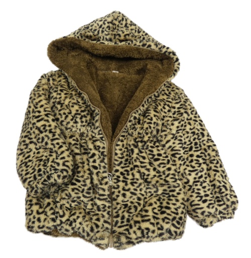 Béžovo-čierna kožušinová zateplená bunda s leopardím vzorom a kapucňou