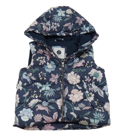 Tmavomodrá šušťáková zateplená kvetovaná vesta s jednorožcami a kapucňou Tu