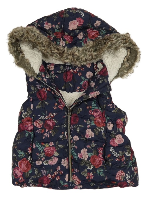 • Tmavomodrá prešívaná šušťáková zateplená vesta s růžemi a kapucňou s kožešinou F&F