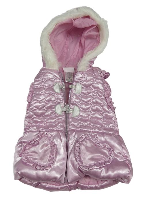 • Ružová lesklá prešívaná šušťáková zateplená vesta so srdiečkami a kapucňou
