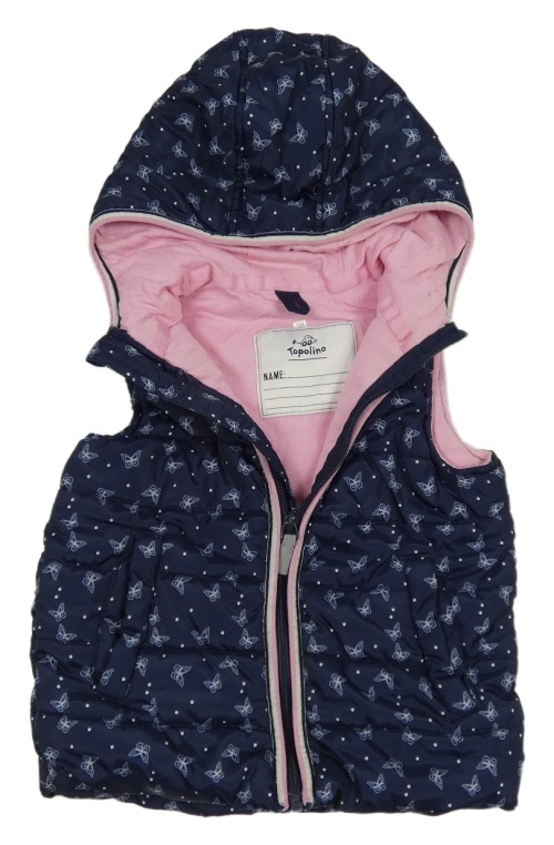 • Tmavomodrá šušťáková prešívaná zateplená vesta s motýly s kapucňou Topolino