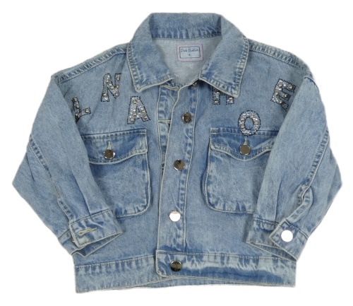 Modrá rifľová bunda s písmeny s kamienkami