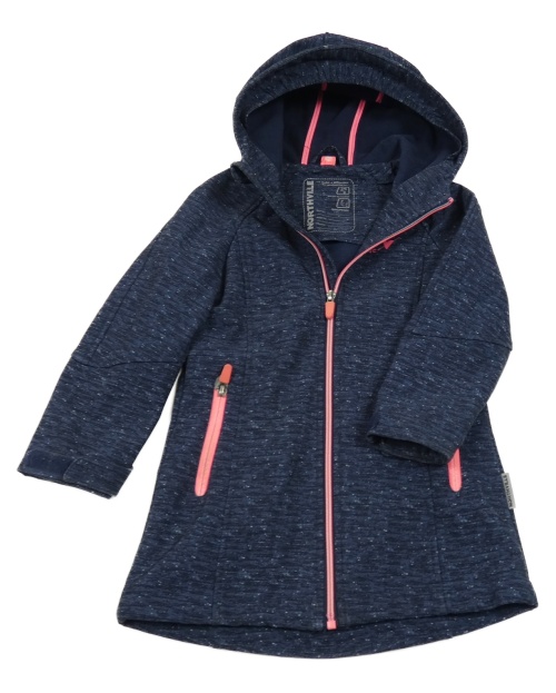 Tmavomodrý melírovaný softshellový kabát s nápismi a srdiečkom a kapucňou C&A