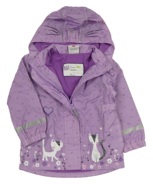 Lila šušťáková vzorovaná jarná bunda s mačkami a kapucňou Topolino