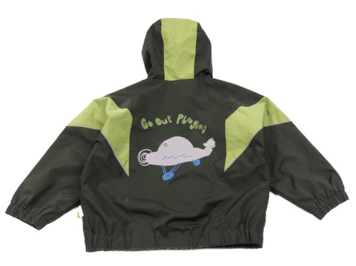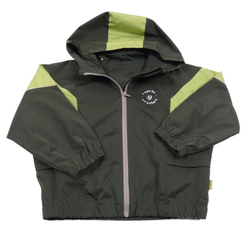 Tmavosivá šušťáková jarná bunda s nápismi a lietadlom a kapucňou