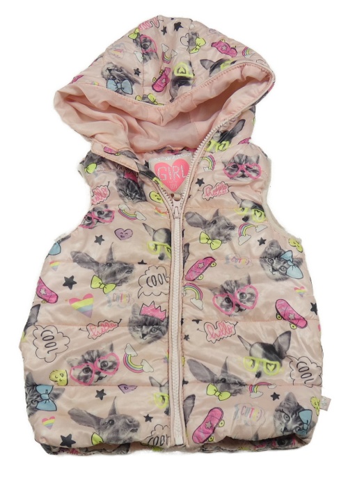 Svetloružová šušťáková zateplená vesta s mačkami a králikmi a kapucňou