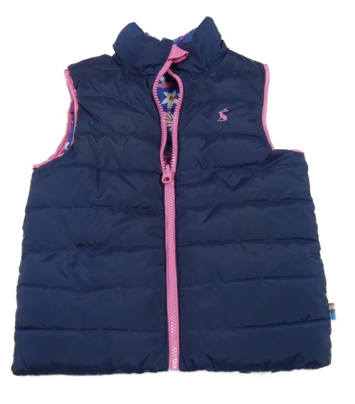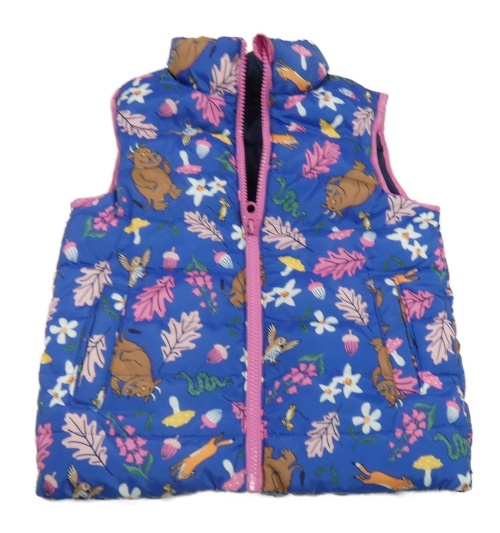 Modrá prešívaná šušťáková zateplená obojstranná vesta s Gruffalem a lístečky a muchomůrkami joules