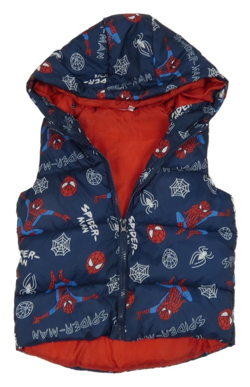 Tmavomodrá šušťáková prešívaná zateplená vesta so Spider-manem a kapucňou