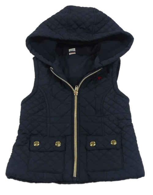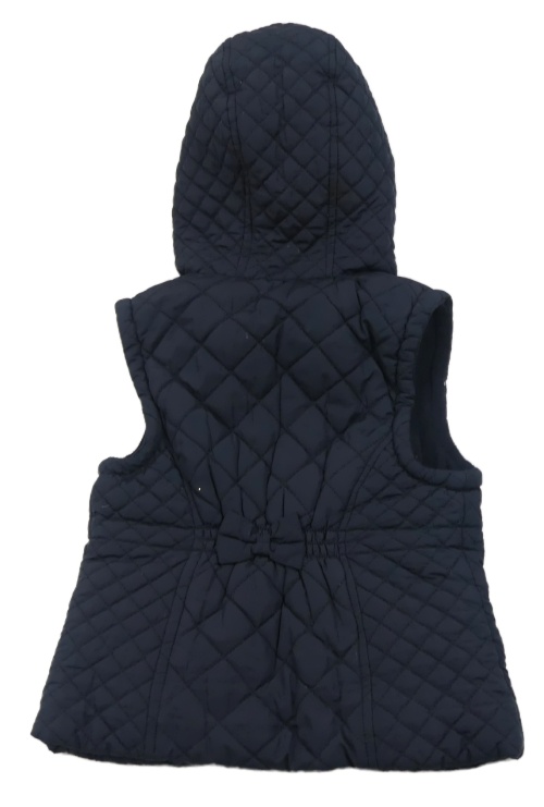 Tmavomodrá prešívaná šušťáková zateplená vesta so srdiečkom a kapucňou Tu