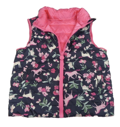 • Tmavomodrá prešívaná šušťáková zateplená obojstranná vesta s jednorožcami a kvietkami joules