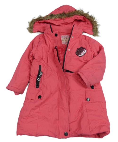 • Jahodový prešívaný šušťákový zimný kabát s jahůdkou z flitrů a odopínacíá kapucňou s kožešinou