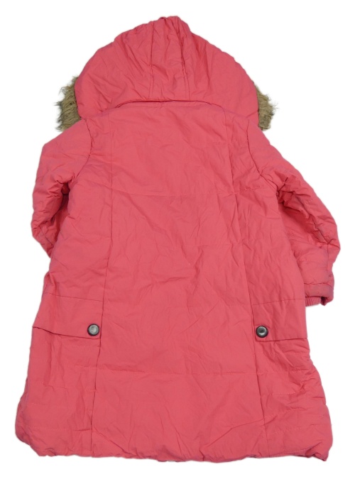 Jahodový prešívaný šušťákový zimný kabát s jahůdkou z flitrů a odopínacíá kapucňou s kožešinou