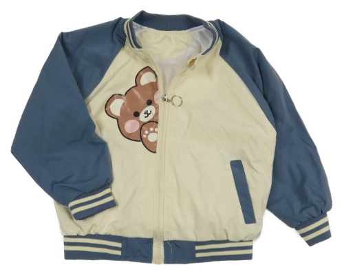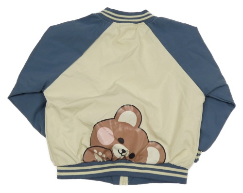 Smetanovo-modrošedý šusťákový jarní bomber s medvedíkom a pruhmi