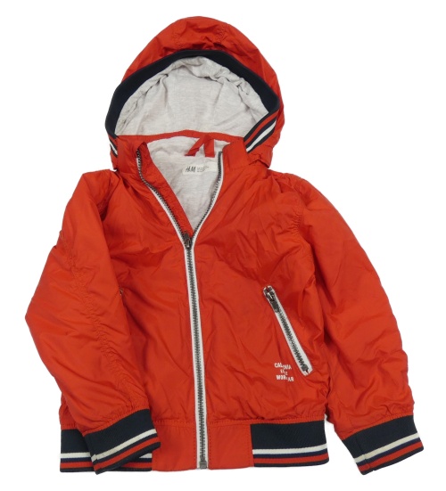 • Červeno-tmavomodrý šusťákový jarní bomber s nápismi a odopínacíá kapucňou H&M