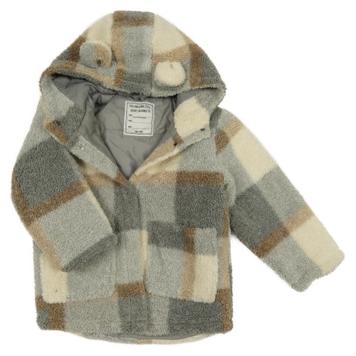 Smetanovo-hnedo-sivá kockovaná huňatá zateplená bunda s kapucňou s uškami Matalan
