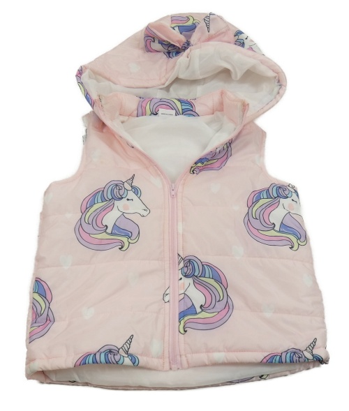Svetloružová šušťáková zateplená vesta s jednorožcami a kapucňou
