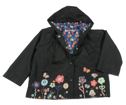 Čierna šušťáková jarná bunda s kvetinami a kapucňou