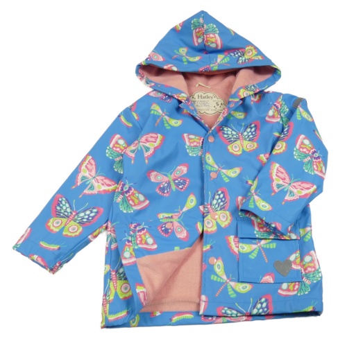 Svetlomodrá vodeodolná jarná bunda s motýlikmi a kapucňou