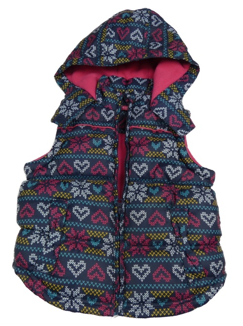 • Tmavomodro-farebná vzorovaná šušťáková zateplená vesta s vločkami a srdiečkami a kapucňou YD